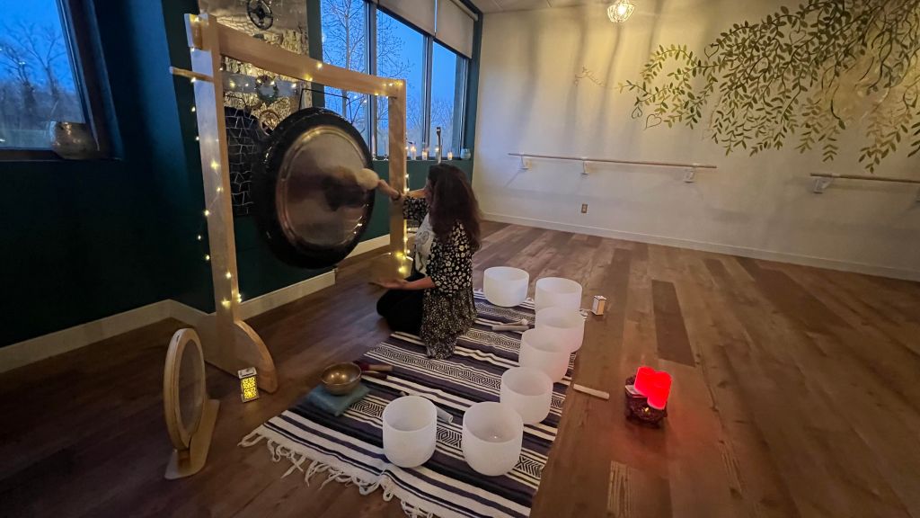 In general, a sound bath is a meditative experience where those in attendance are “bathed” in sound waves. These waves are produced by various sources, including healing instruments such as gongs, singing bowls, percussion, chimes, rattles, tuning forks, and even the human voice itself. The intention is really to change and help balance the energy of the participants. During a sound bath, you don’t want to hook into a melody. You don’t want to repeat things because you don’t want the brain to recognize a repeated beat. Instead, you want participants to release, and you want the brain to let go.